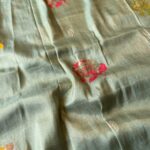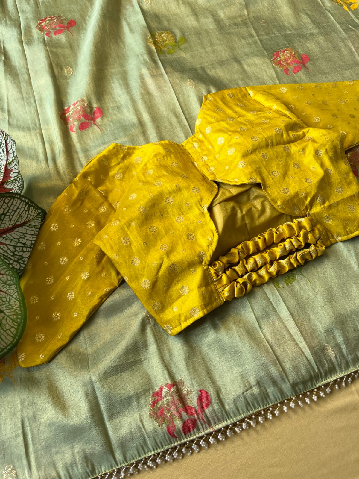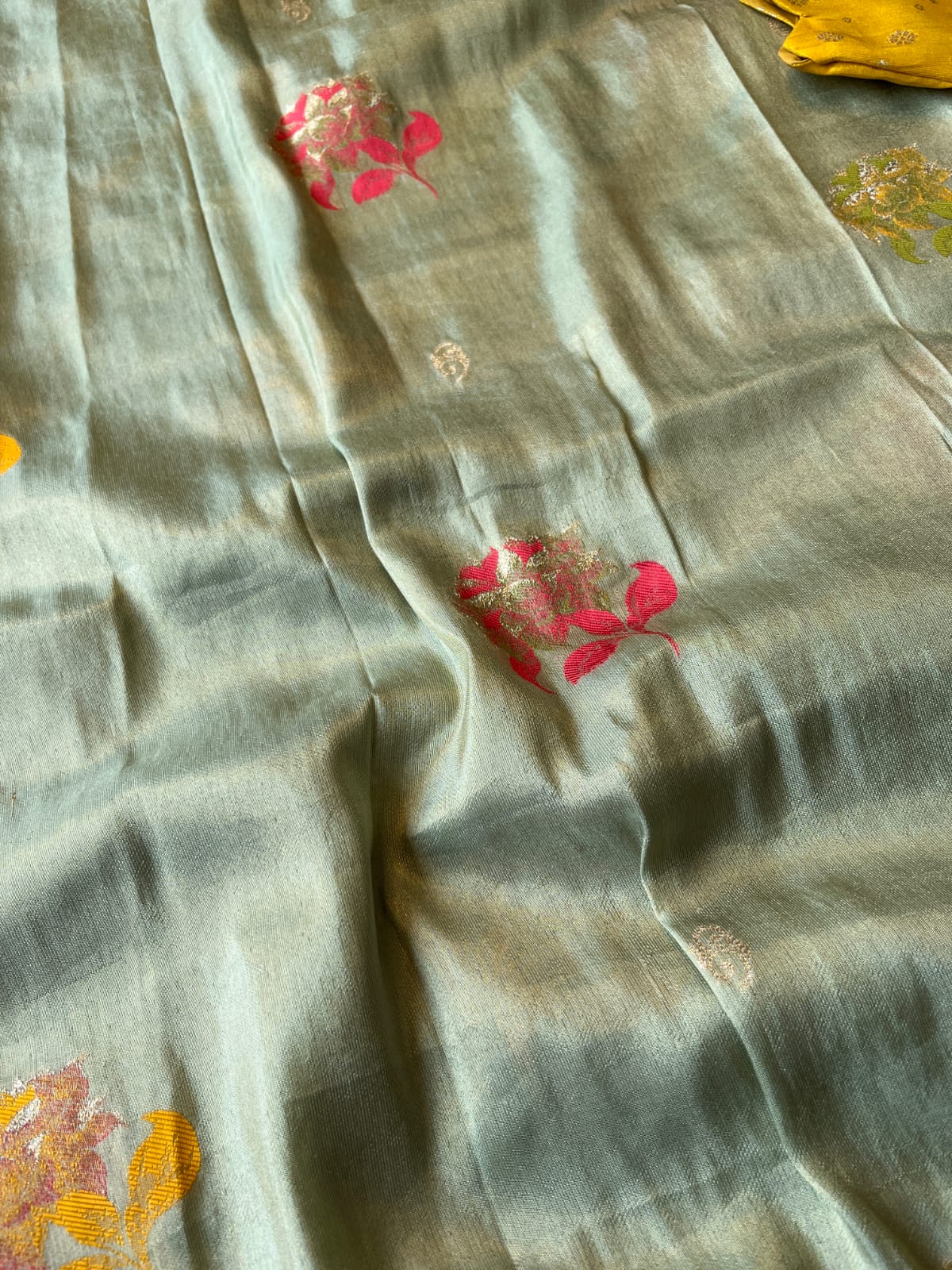 Saree :- Viscose Tissue silk with 3D floral weaving with Maggam Moti work lace