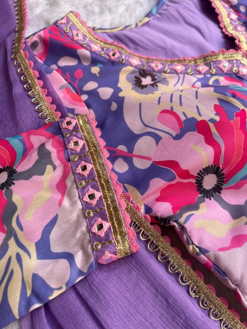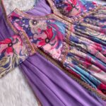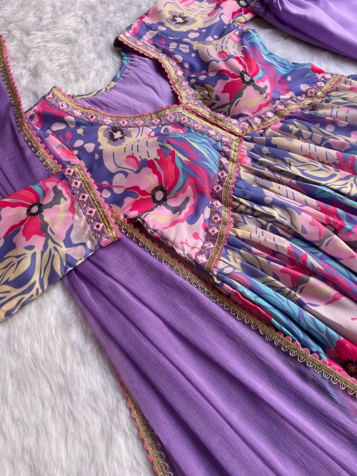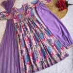 👗Dress Cotton BSY Soft Muslin Cotton With Digital Lily💐Printed Sky ,Lavender Color Beautiful Hand made and Cotton Gpo less , Embroidey Thread Work Flair 3. +MTR 🪷 Sleeve Length 21+