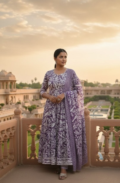 Elegant Jaipur cotton Anarkali kurti set featuring soft fabric, detailed floral prints, and a flowy silhouette.