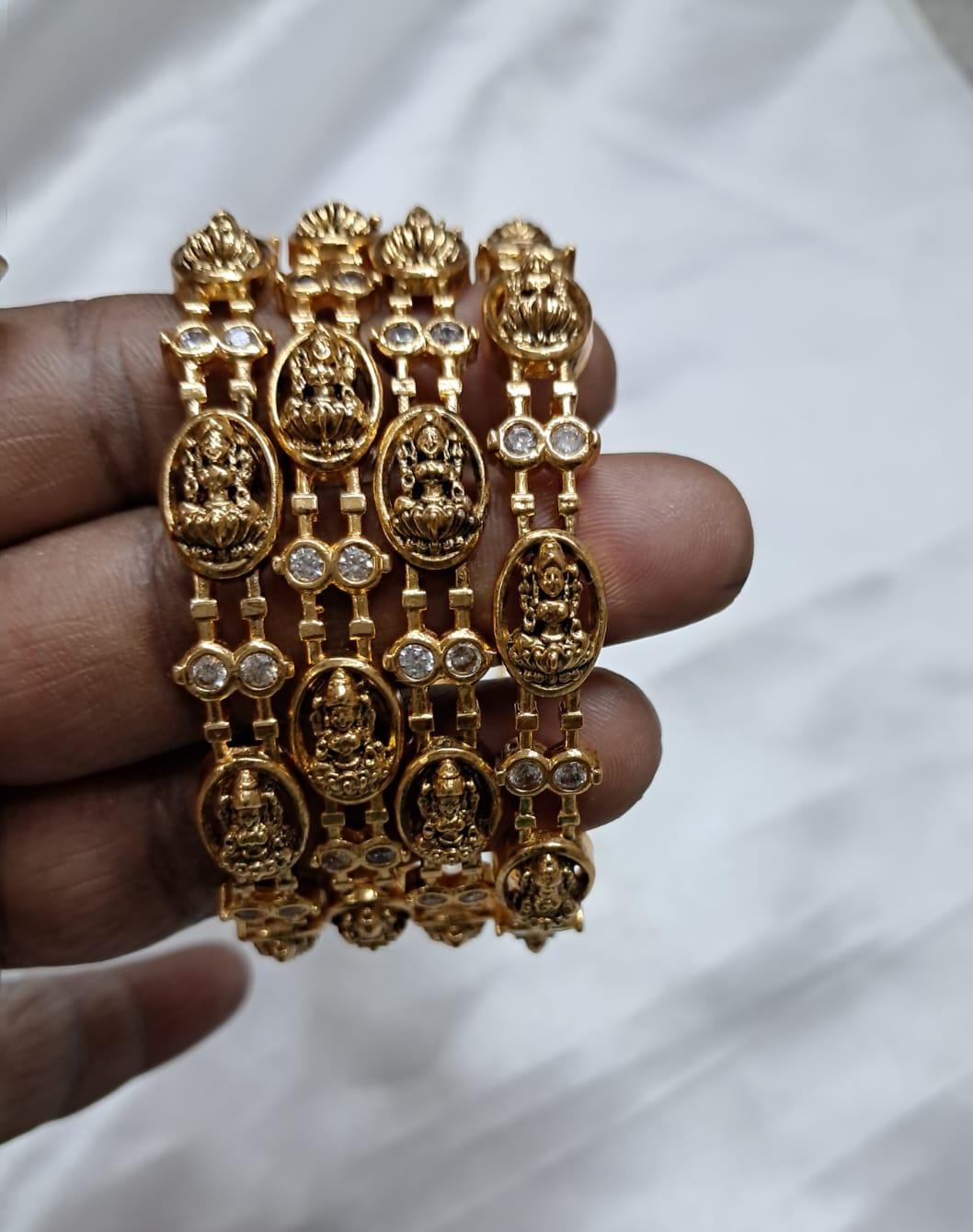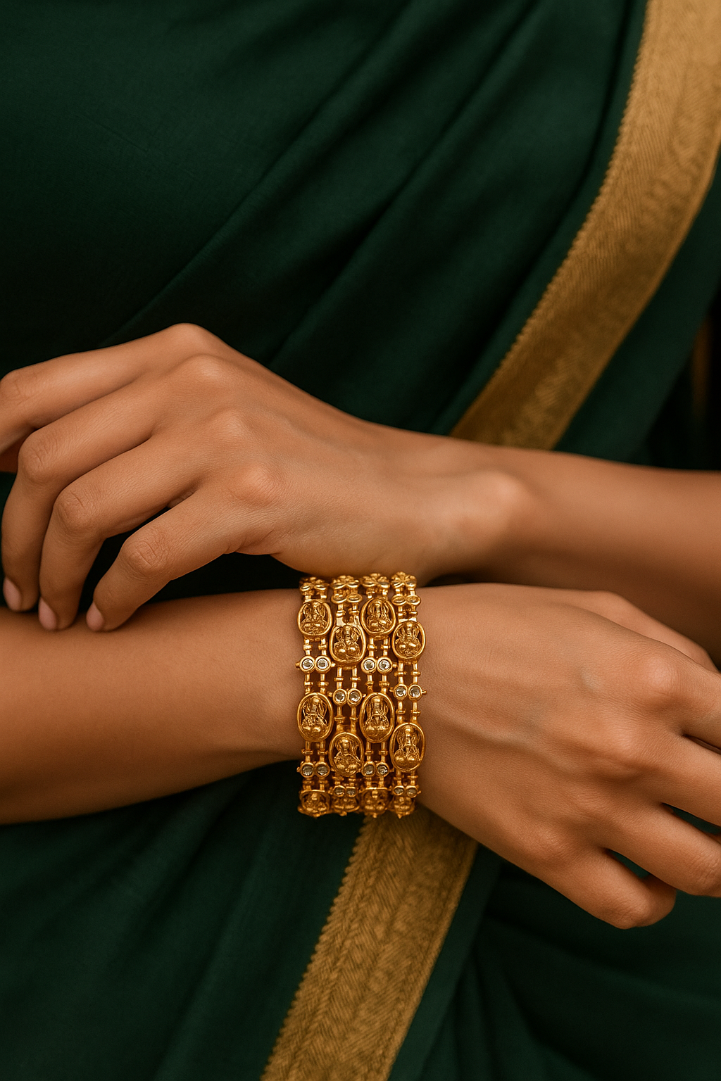 Grace your wrists with timeless beauty through our Antique Lakshmi Bangles Online. Each bangle carries the divine aura of Goddess Lakshmi, blending temple art with antique craftsmanship. More than jewellery, these bangles are a symbol of tradition, prosperity, and elegance. A perfect match for sarees and festive attire, they bring an aura of heritage to your look.