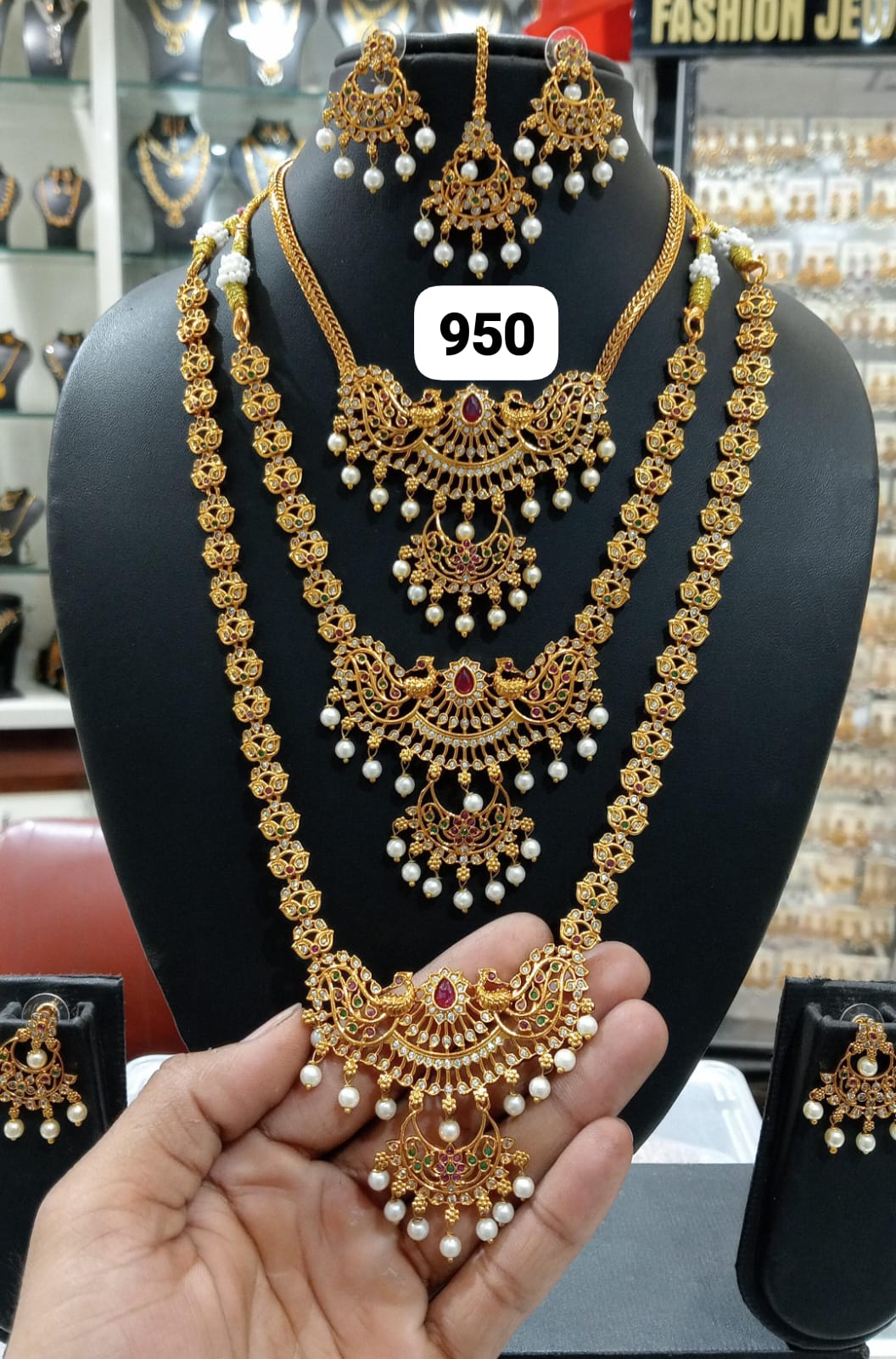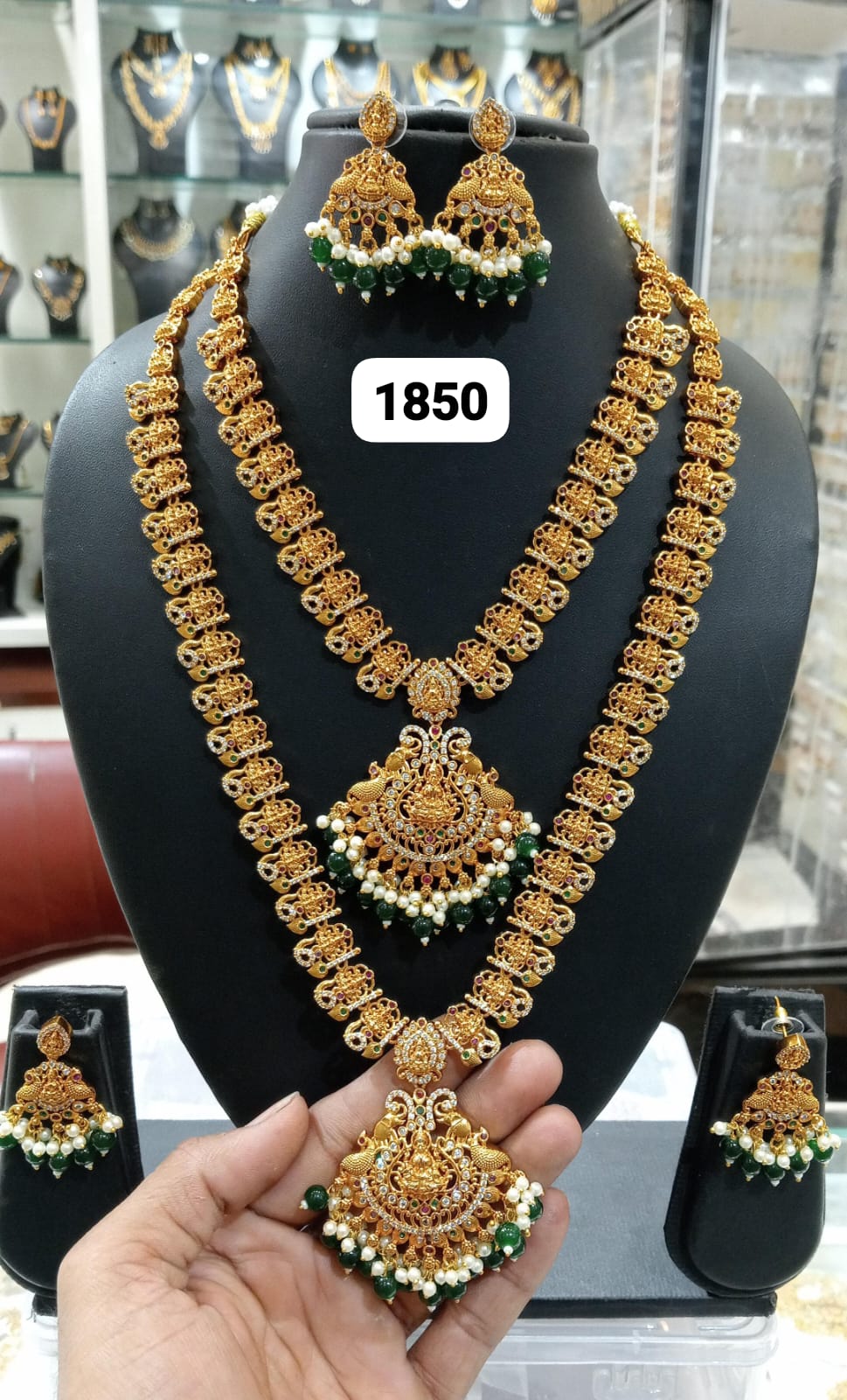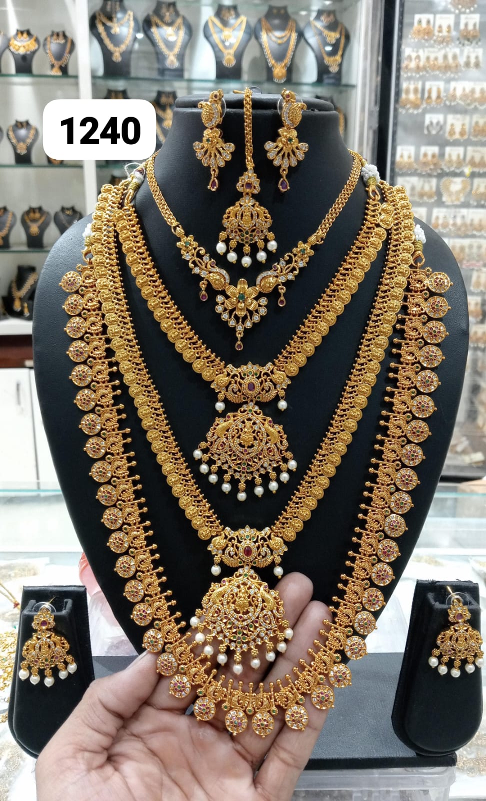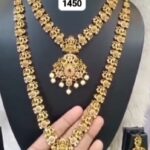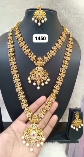Rich gold tones and antique-inspired designs highlight fine craftsmanship. Stone embellishments add a classic bridal touch. This combo pairs beautifully with silk sarees, lehengas, and traditional bridal wear.