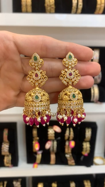 These exquisite Buttalu Jhumkas are crafted with rich traditional detailing and fine stone work, giving them a premium and timeless appeal. The intricate patterns, embossed finish, and beautifully arranged hangings add graceful movement and elevate any ethnic look. Lightweight yet grand in appearance, these jhumkas are perfect for festive occasions, cultural events, and special celebrations.
