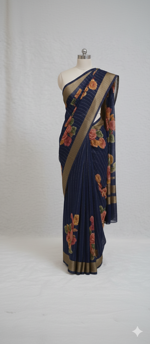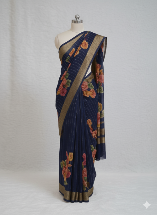 featuring a navy base with multi colour floral prints, golden stripes, and a rich zari-woven border.