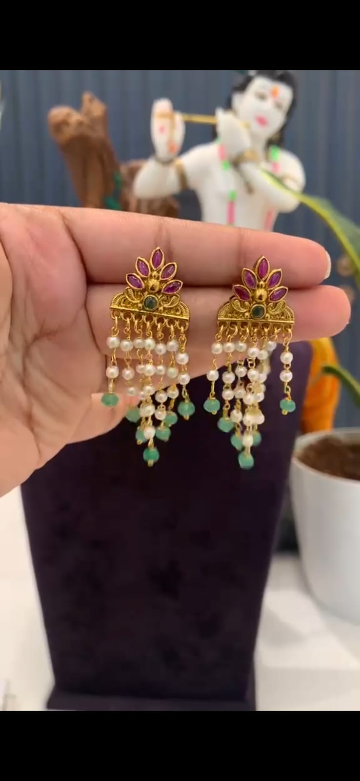Beautiful gold-finish earrings with stone and pearl/bead detailing that give a rich festive look at a budget price. Lightweight, comfortable and perfect for ethnic or fusion outfits for functions and outings.