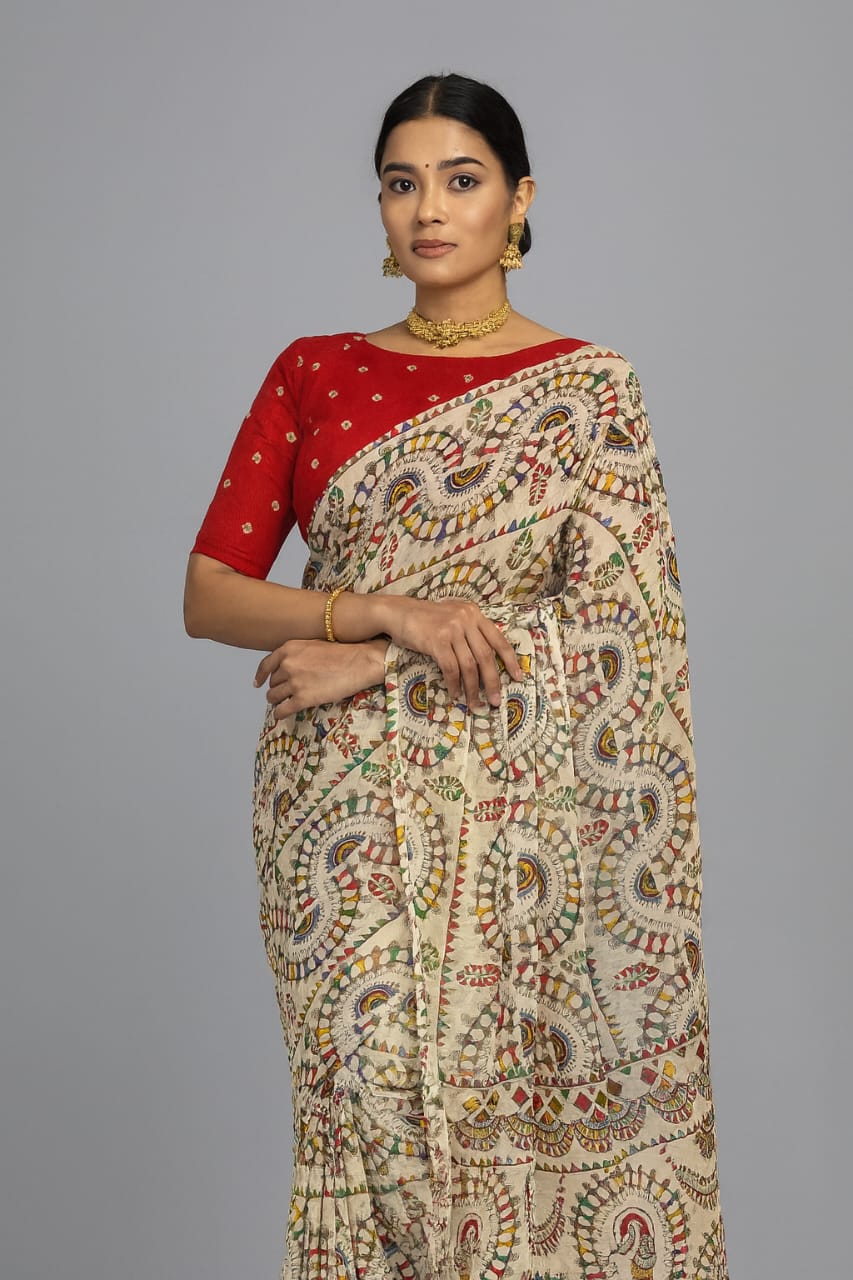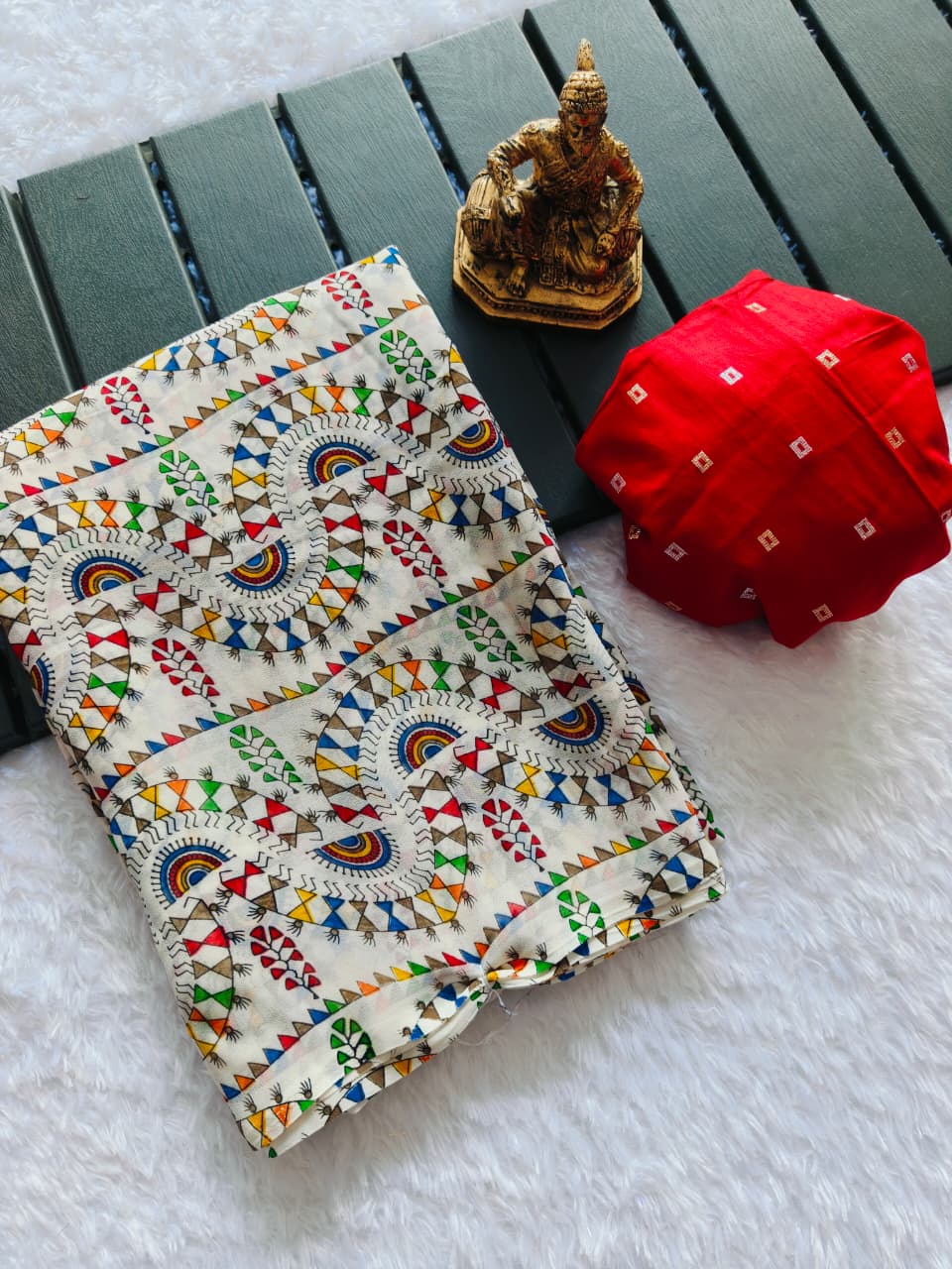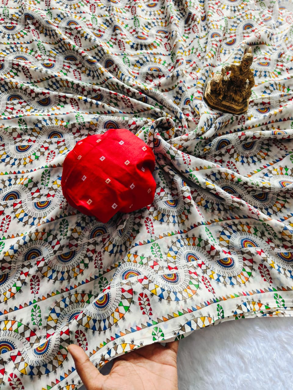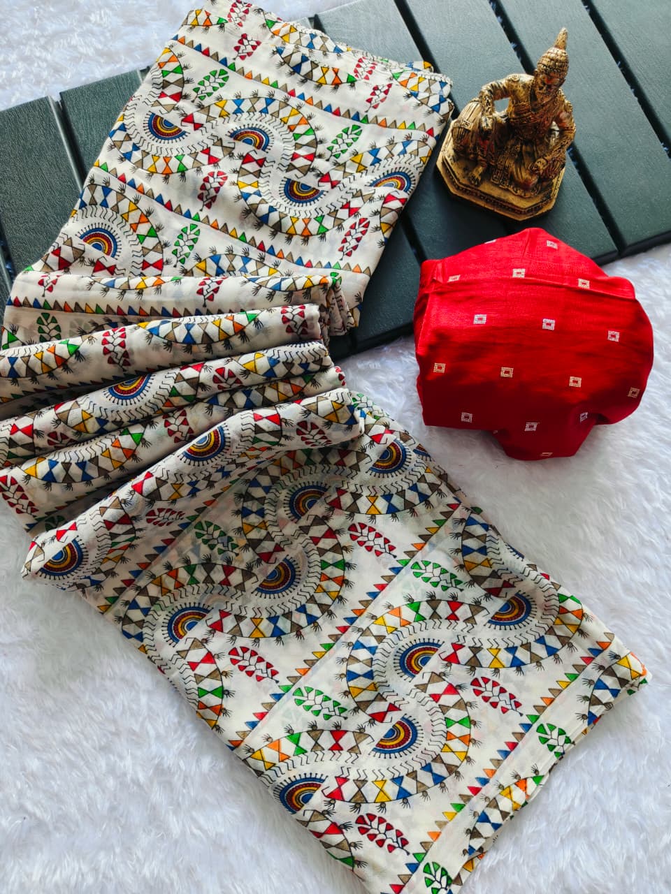 Discover elegance at an affordable price with our Georgette Sarees Below 500. Crafted in heavy Marshmallow georgette, this saree features a stunning Warli discharge padding print spread beautifully across the drape. The design is enhanced with a perfectly matched pallu, making it ideal for daily wear as well as special gatherings.