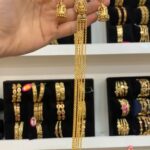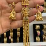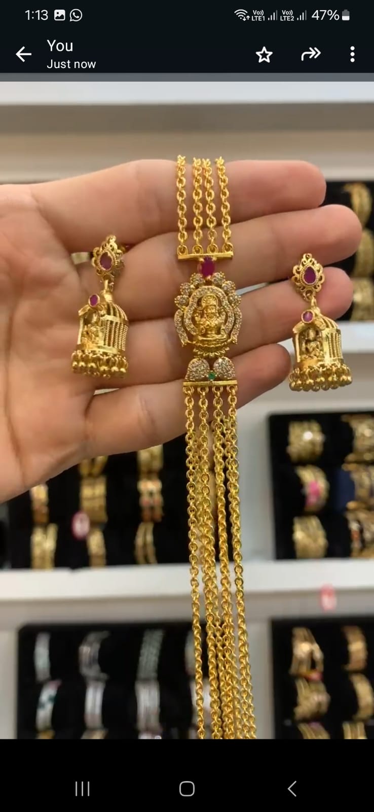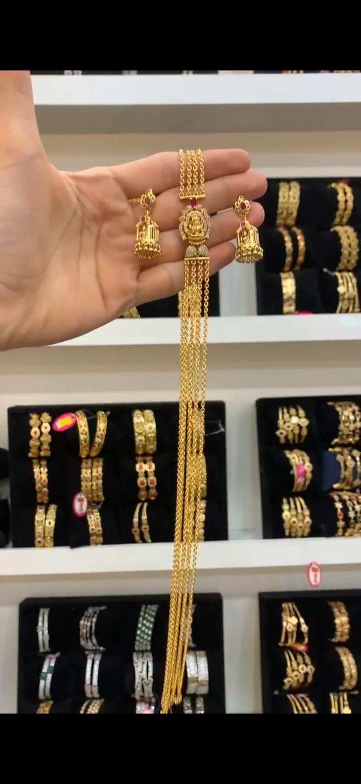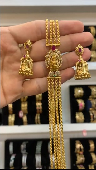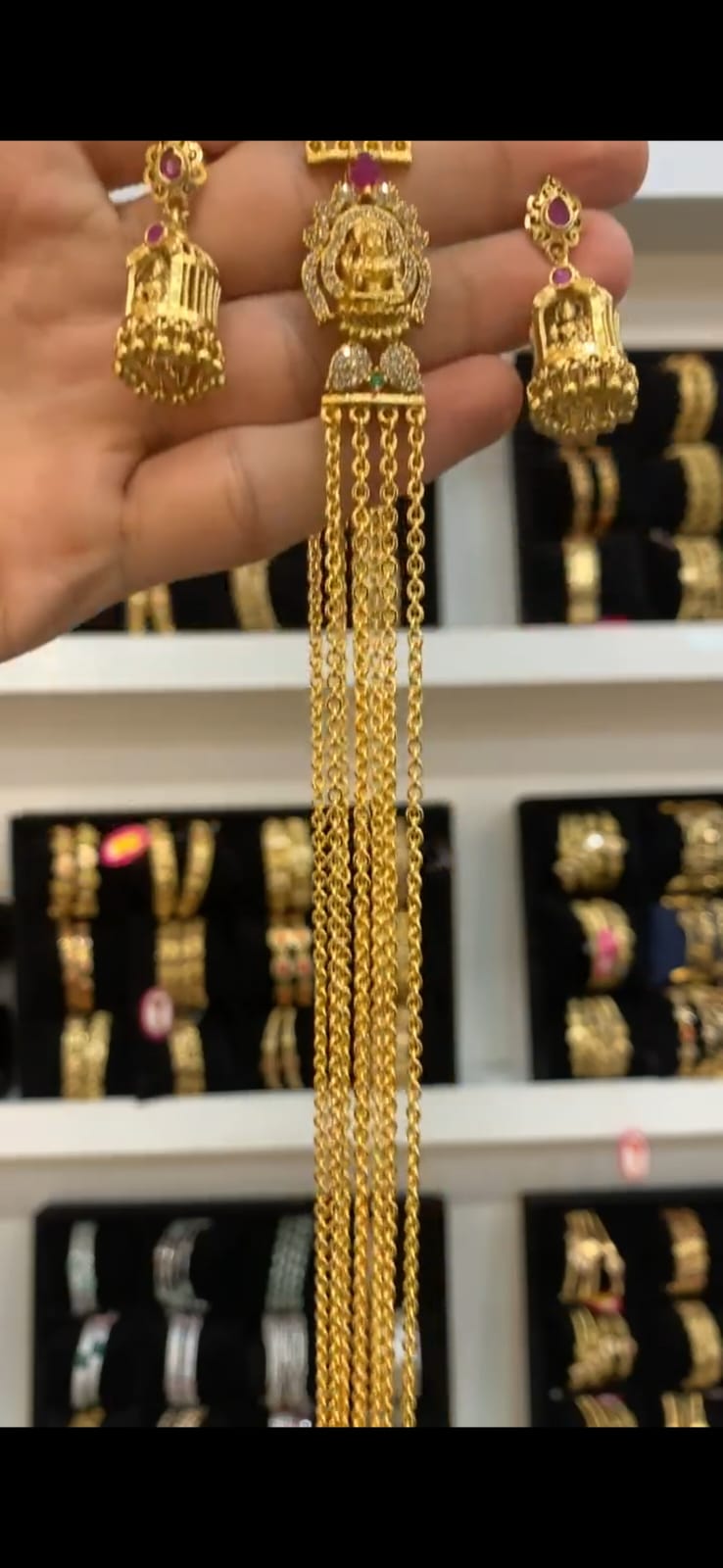 This gold plated Chandraharam features a traditional temple-inspired design with a beautifully detailed goddess motif at the center. The long layered chains add a graceful flow, while the intricate craftsmanship gives it a rich, heritage look. Designed to elevate ethnic outfits, this statement necklace reflects timeless South Indian jewelry artistry with an elegant finish.