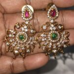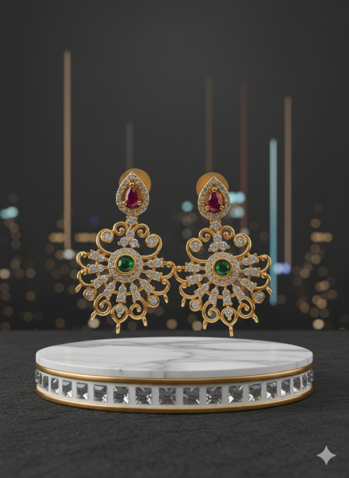 Gold Plated Earrings – Intricately designed with shimmering white stones, highlighted with a green center stone and a red teardrop accent. A perfect blend of elegance and traditional charm, suitable for festive and party wear.