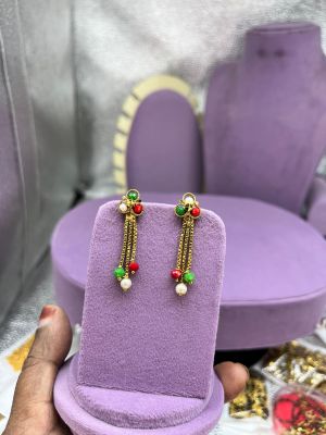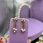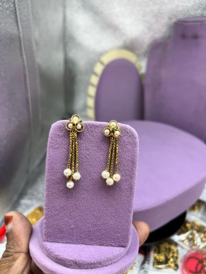 Charming gold replica earrings with delicate design and graceful hanging beads. A perfect accessory for traditional and celebration wear.