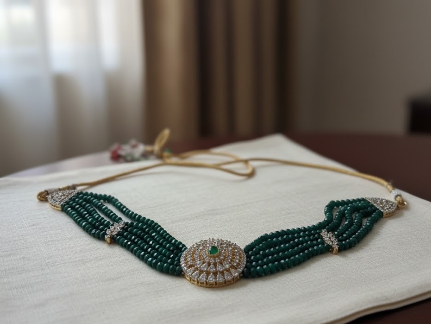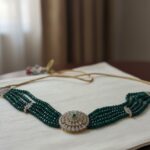 Elevate your ethnic charm with this elegant green beads choker, featuring multiple strands of finely polished beads accented with a dazzling central pendant. The intricate stone detailing in gold-toned settings adds a regal touch, making it perfect for festive occasions or graceful evening looks.