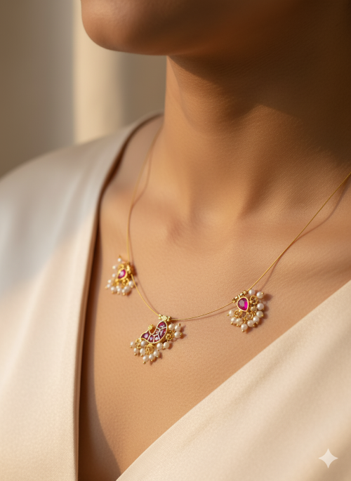 Add a touch of elegance with this invisible necklace, beautifully designed in Jadau style with vibrant red stones and pearl hangings. Lightweight and stylish, it perfectly complements ethnic wear, festive looks, and party outfits.