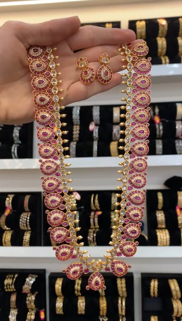 This elegant Jadau Kundan haram showcases intricately set kundan stones highlighted with pearl accents, creating a rich traditional appeal. Crafted in a long haram style, it reflects timeless craftsmanship and refined detailing. A statement jewellery piece that enhances sarees, half sarees, and ethnic ensembles with graceful charm.