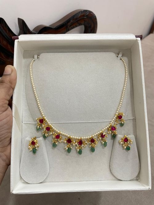 Elevate your traditional look with our exquisite Jadau Kundan Pearl Choker, a masterpiece that blends royal craftsmanship with timeless beauty. Handcrafted with detailed Kundan stones and delicate pearl strings, this choker exudes regal elegance and charm. Perfect for special occasions, this statement piece highlights intricate artistry and adds a luxurious touch to any ethnic outfit.