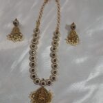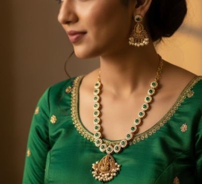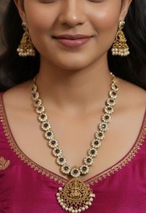 Step into timeless elegance with this handcrafted Kempu Stone Jewellery Set, designed with intricate detailing and a divine Lakshmi pendant. The blend of antique gold tones, rich kempu stones, and graceful pearl drops gives it a classic South Indian charm—perfect for enhancing any traditional look. Please check the video here