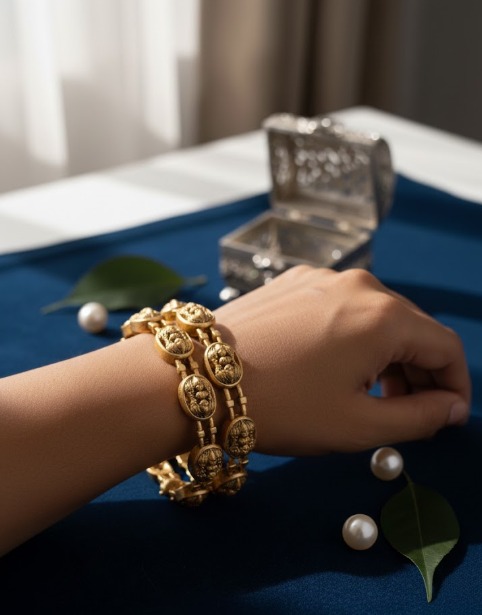 With antique gold plating and intricate goddess detailing, these bangles bring prosperity, grace, and a touch of heritage to every occasion.