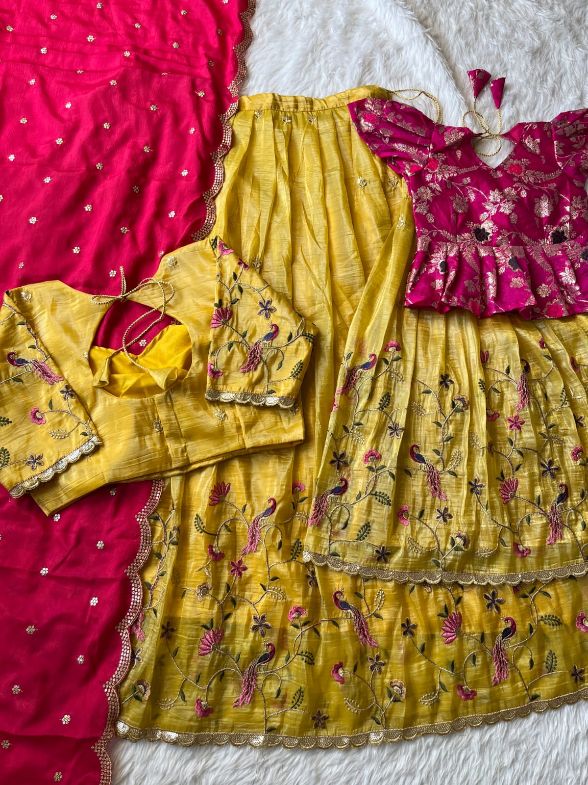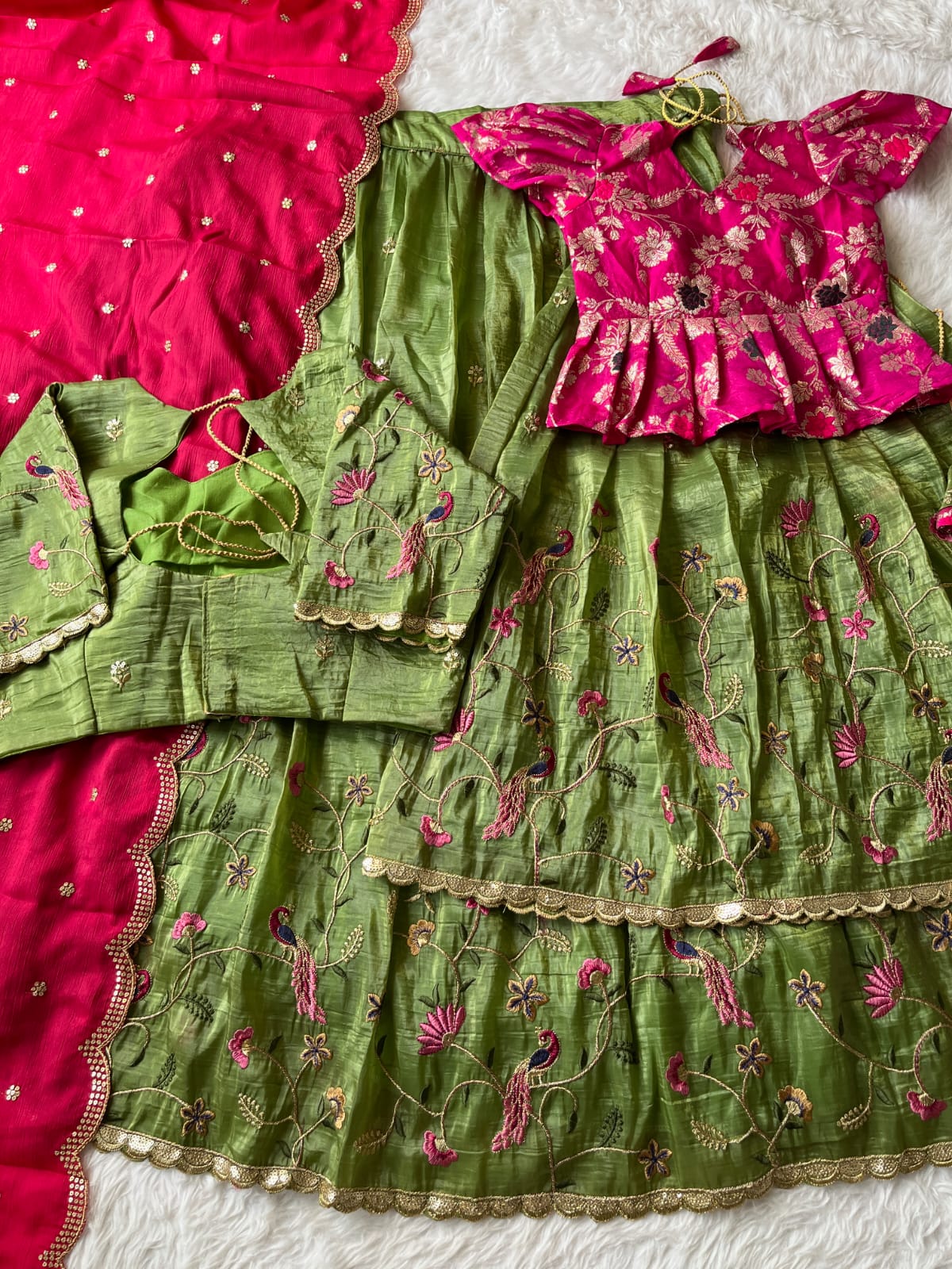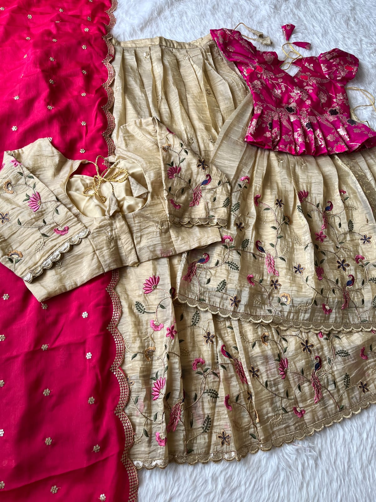Mom & Daughter Lehengha Fabric – Gold crush with peacock embroidery work