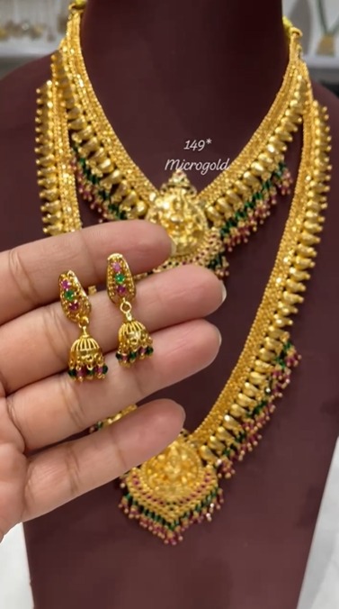 One gram gold jewellery sets with rich micro gold finish, featuring an elegant layered necklace and matching jhumka earrings. Crafted for a traditional look with lasting shine, ideal for festive and special wear.