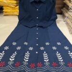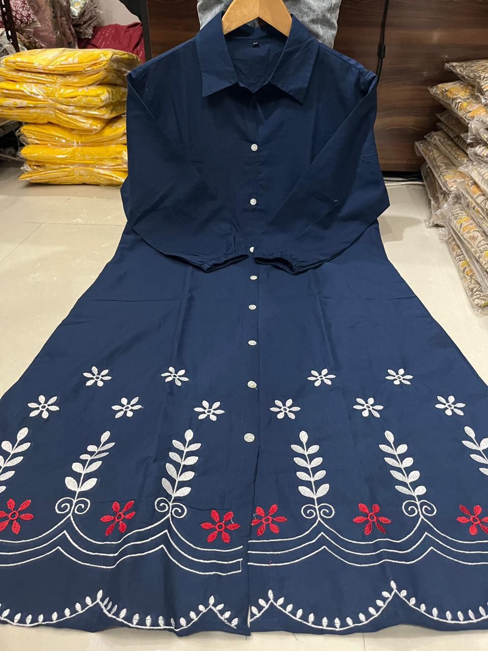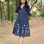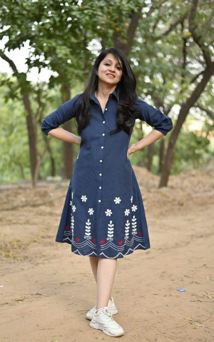 A glimpse into the delightful denim blue hand aari embroidery work one piece A line style midi style.