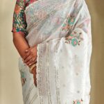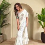 👉🏻🥻 Premium crush organza Saree with self sequins weaving pattern all over the Saree with scallop Border Blouse:- contrast kalamkari prints blouse