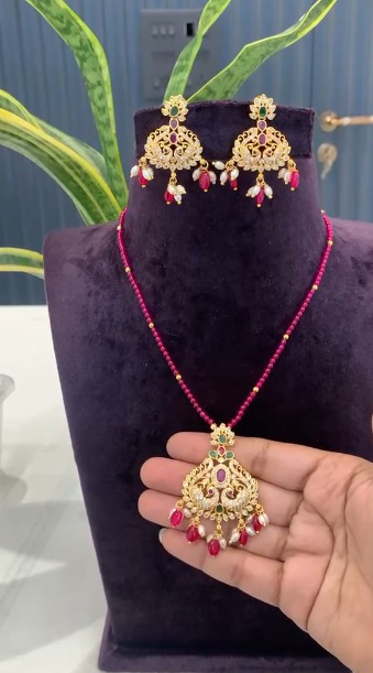 Add a pop of elegance to your jewellery collection with this beautiful pink beads necklace set featuring a grand pendant and matching earrings. The rich bead detailing combined with traditional design makes it perfect for statement styling.