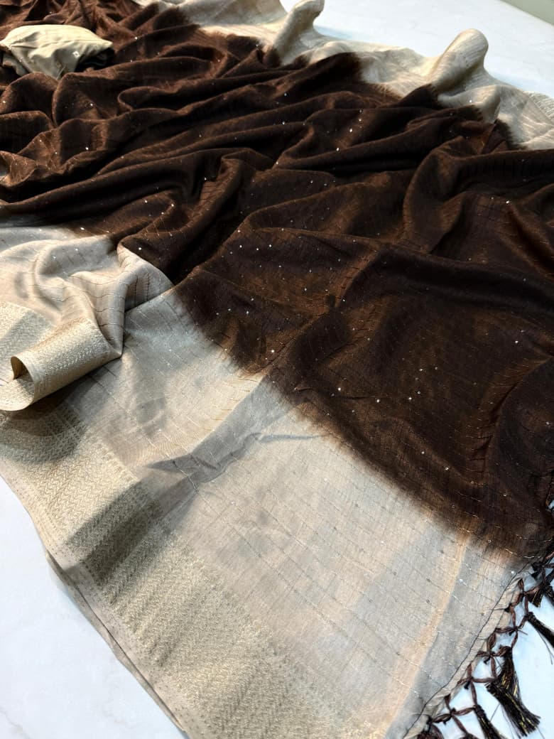 Introducing our Premium Dola Siquance Silk Saree in an elegant coffee shade. Crafted with care, this saree offers a buttery soft texture, smooth drape, and luxurious finish, making it the perfect blend of comfort and sophistication.