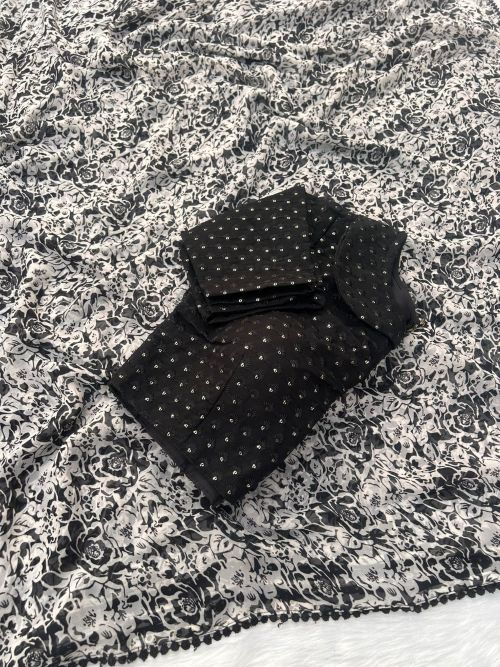 it comes with a ready-made designer lace border and an exclusive stitched Chikankari blouse, adding a touch of elegance to your look.