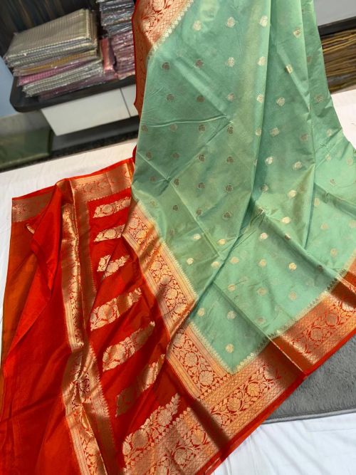 Discover timeless elegance with our Banarasi Dyble Rao Mango Soft Silk Sarees online, crafted to perfection for a graceful look. This saree features: