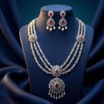 Elevate your jewellery collection with this stunning silver polish necklace set, crafted to make a graceful statement. Designed with intricate detailing, the layered necklace features sparkling stone work highlighted by elegant green stone accents at the center. The beautifully crafted pendant adds a royal charm, finished with delicate hanging drops that enhance its traditional appeal.