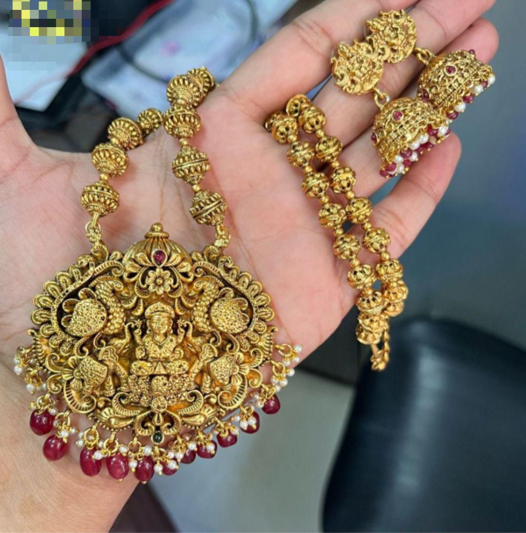 Features an intricately crafted Lakshmi motif for a rich bridal look.