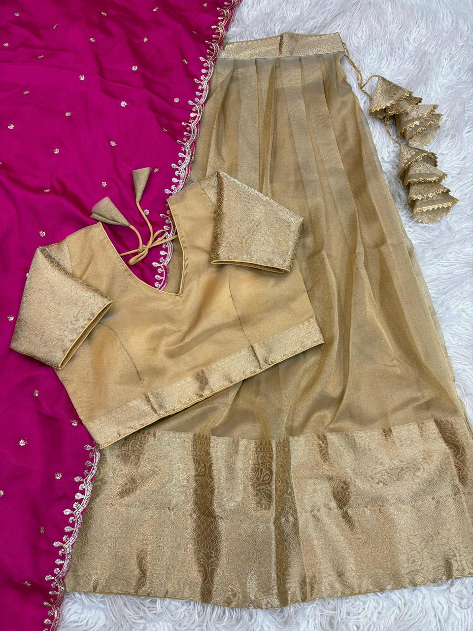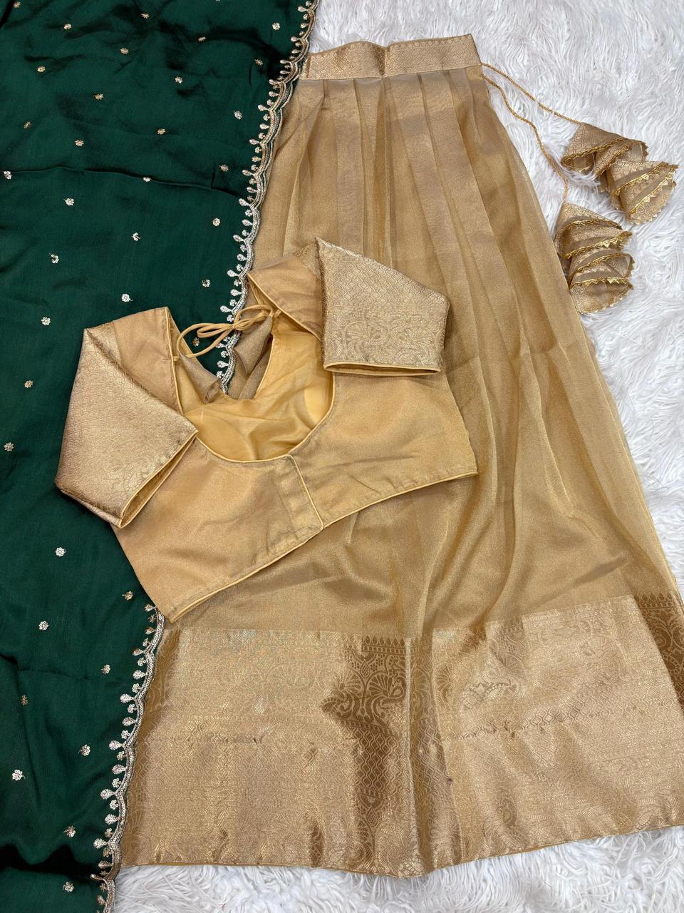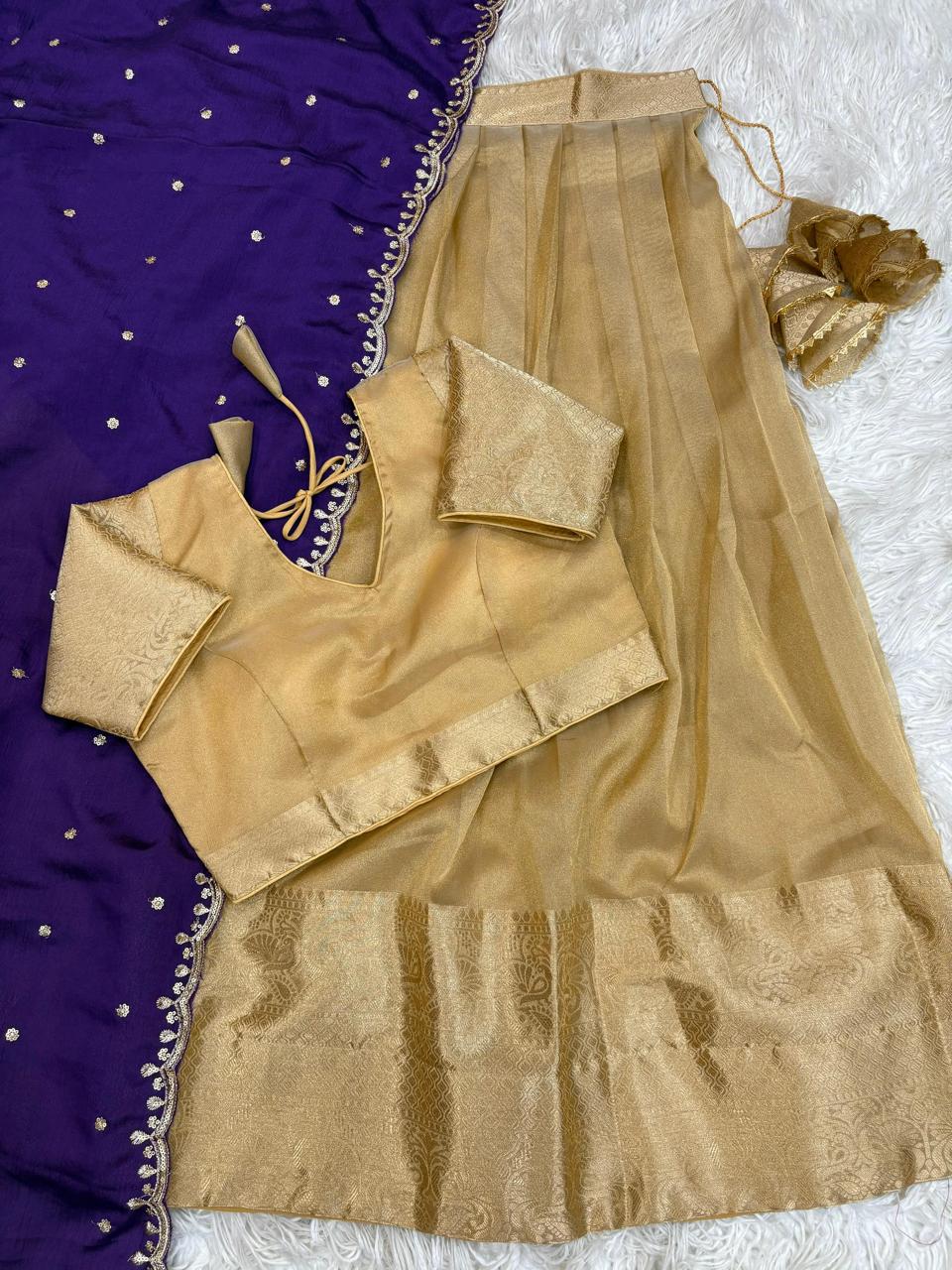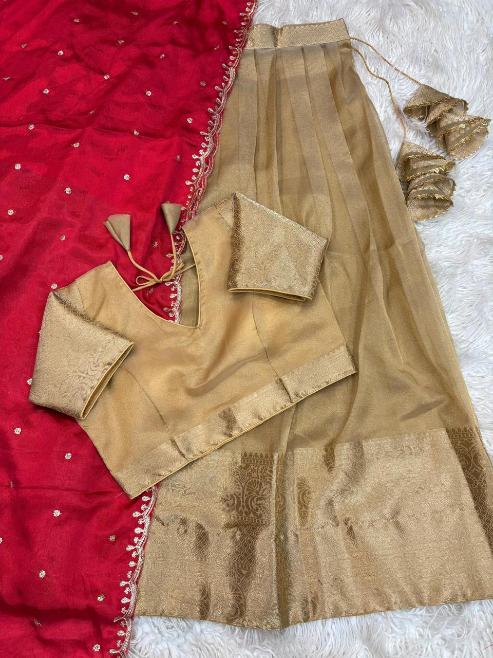 Pure Banarashi golden Tissue fabric with jacquard with full stitched lehanga and blouse and Duppata